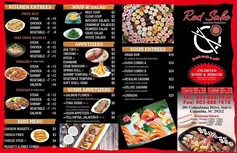 Welcome to Red Sake Japanese Restaurant, located at 285 Columbiana Dr #G, Columbia, SC. This vibrant eatery excels in offering an extensive menu that tantalizes the palate while keeping the prices reasonable. The star of the sushi appetizers includes the Salmon Flower and the delectable Tuna Tataki, each expertly crafted to showcase fresh ingredients. For those seeking a true chef’s touch, the Spider Roll and Black Dragon Roll are highlights that fuse flavors and textures beautifully.